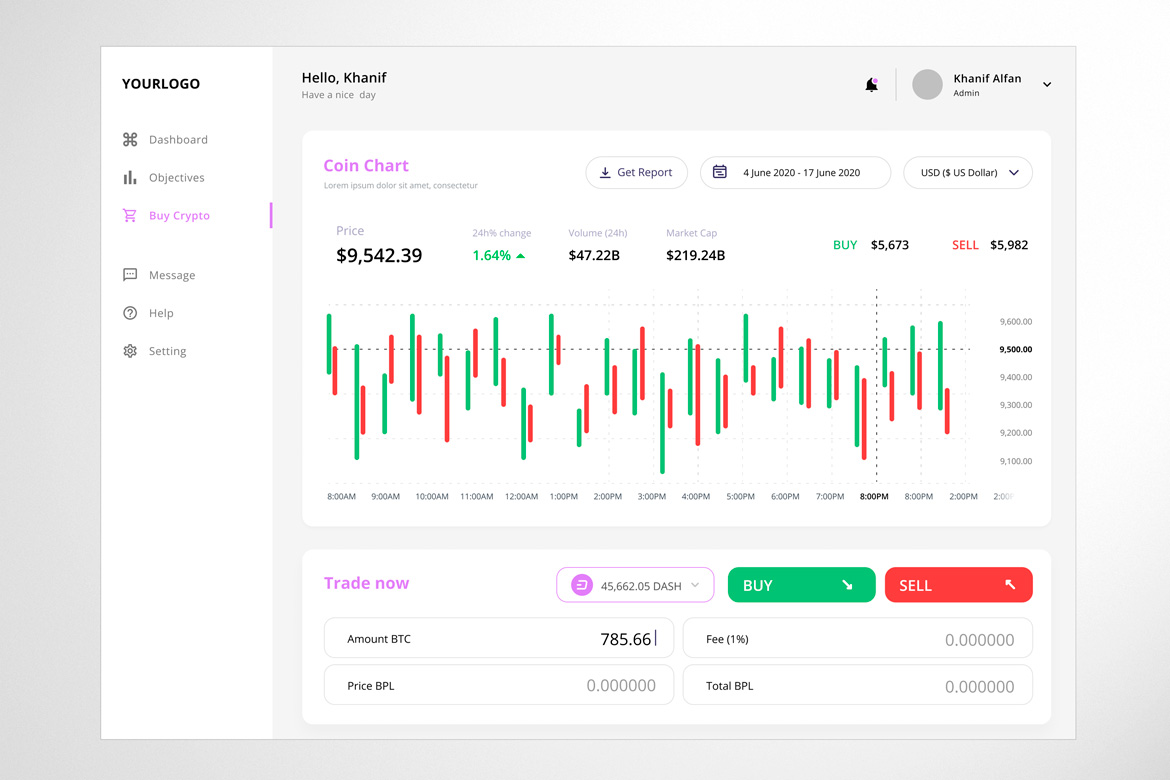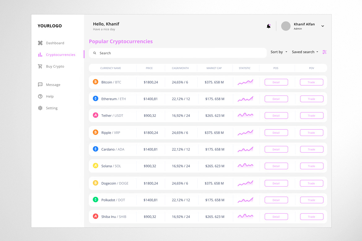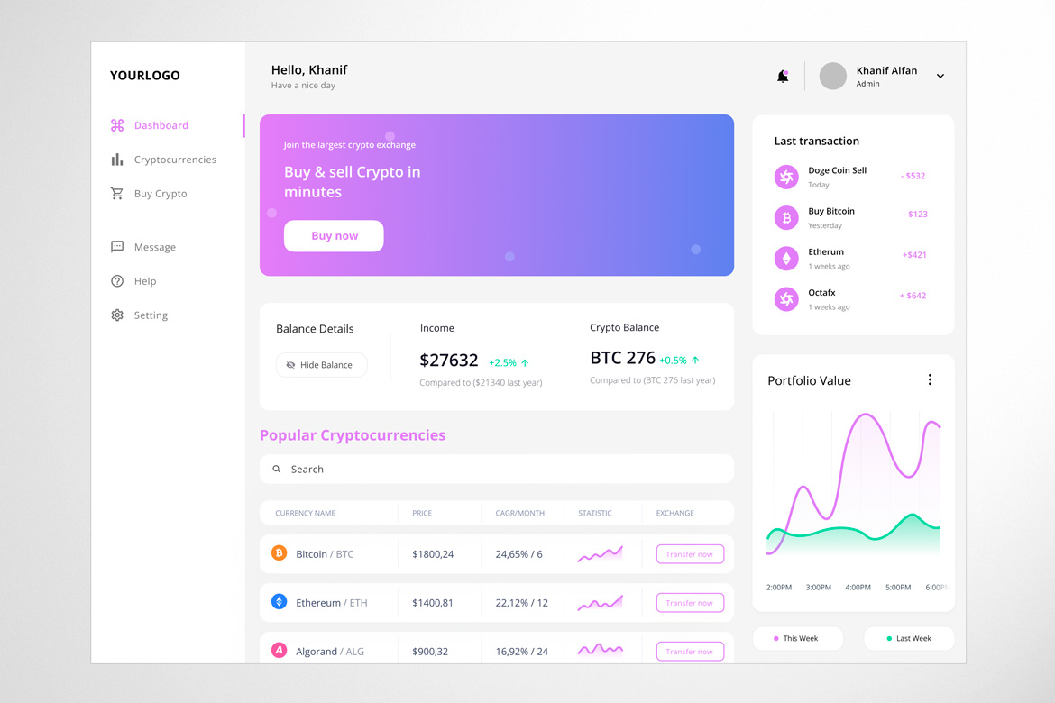The platform integrates real-time market tracking, portfolio overview, transaction history, asset discovery, and trading execution within a unified web experience. The main challenge was balancing high-density financial data with clarity, visual hierarchy, and usability.