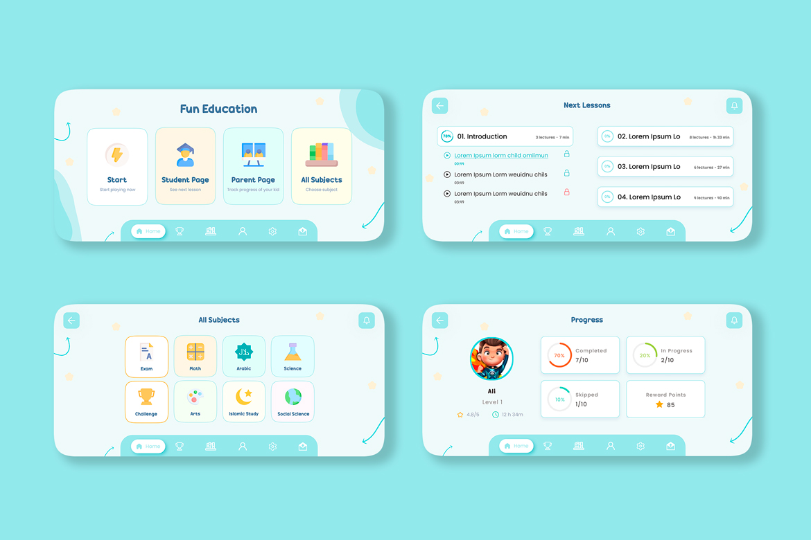 Designed an interactive learning app for children, focused on engagement through gamification and visual clarity. The experience includes lessons, progress tracking, and rewards, presented in a playful and intuitive interface.